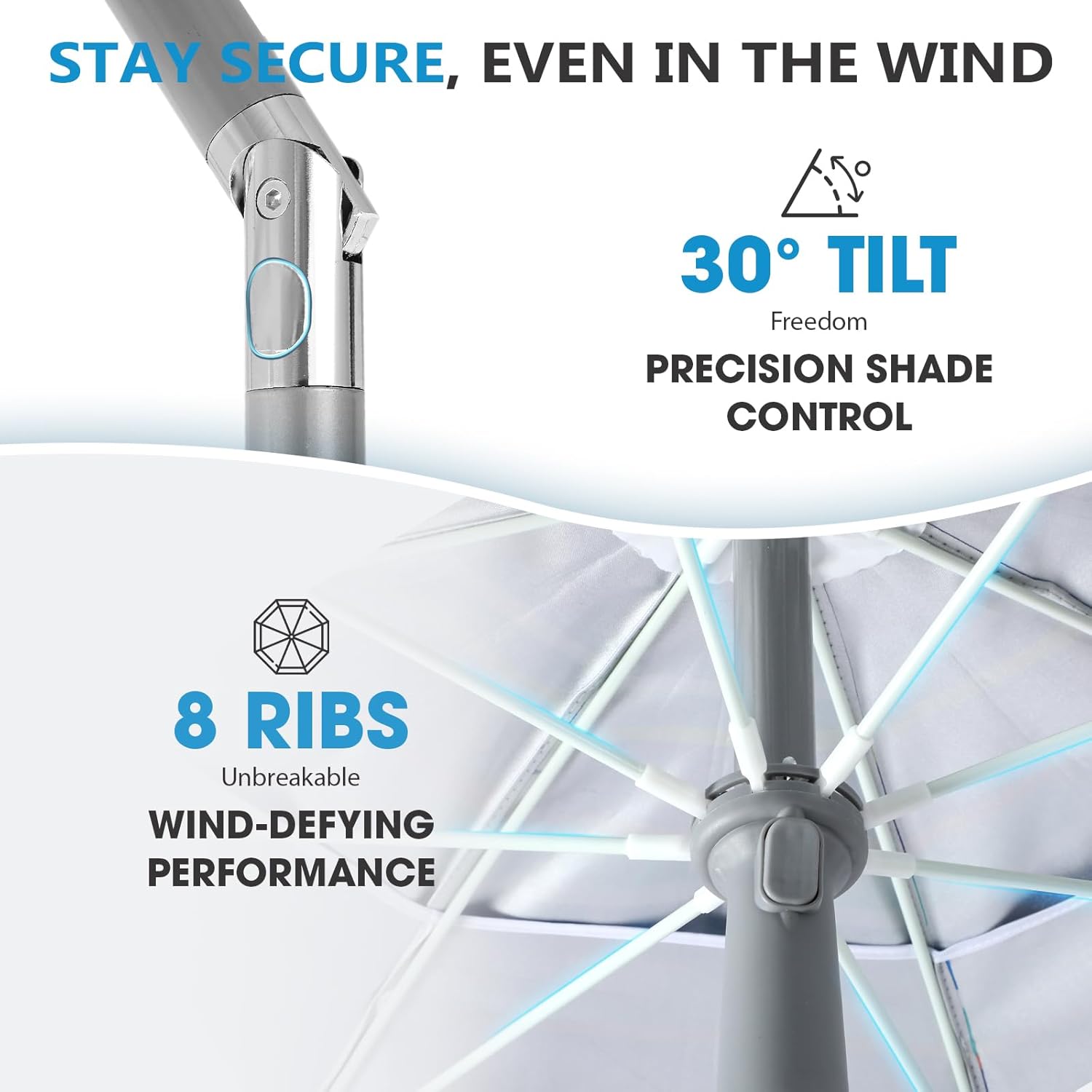 7ft Beach Umbrella featuring a built-in table with Sand Anchor & Tilt, UPF 50+ Protection Beach Umbrellas for Sand, Umbrellas for Heavy Duty Wind Portable with Carry Bag, Dark Blue Stripes(Random pattern)