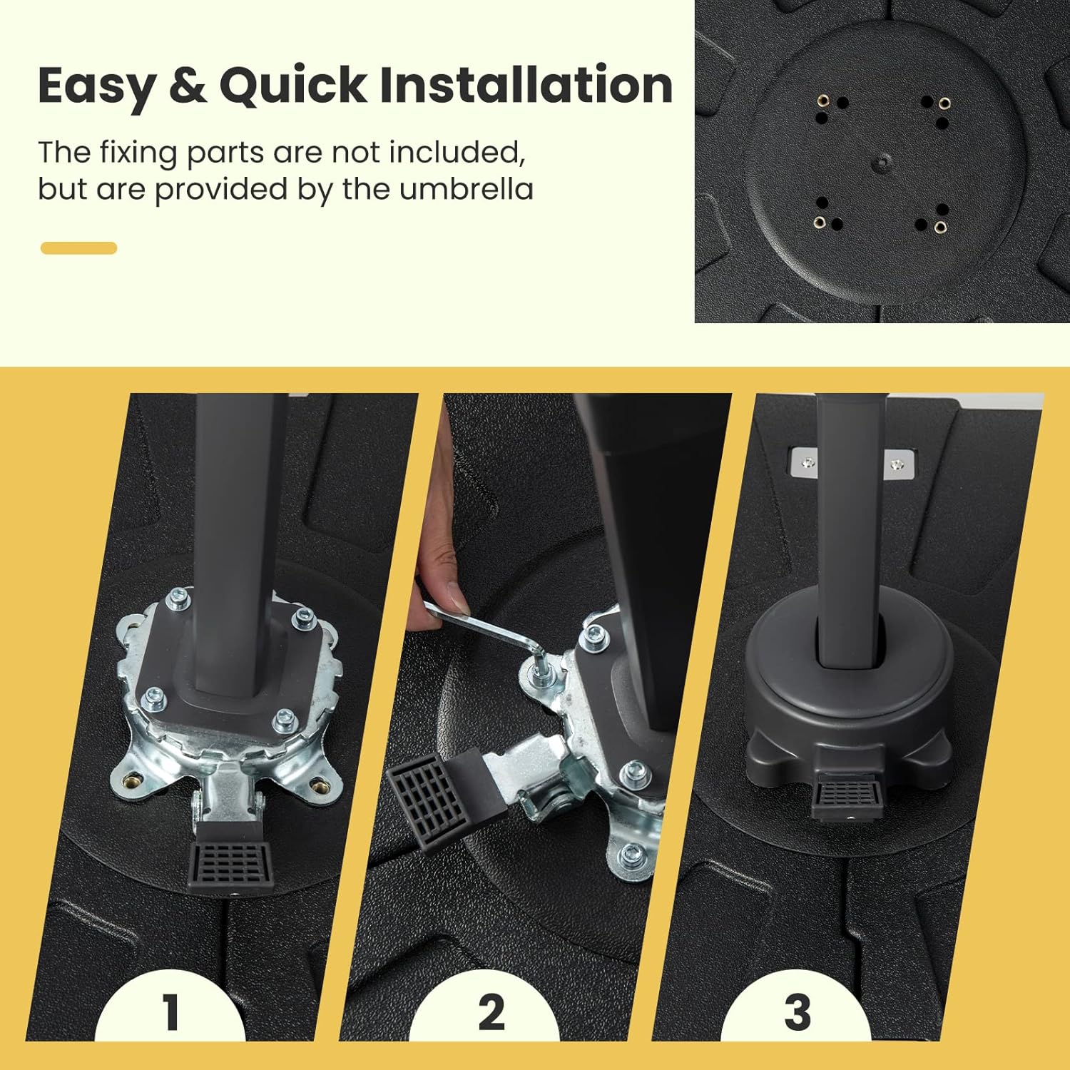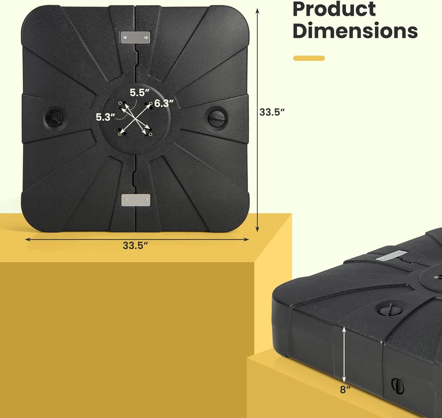 Our fillable patio cantilever umbrella base features 2 large reservoirs that hold up to 90 L water, enhancing wind resistance and stability. This heavy-duty outdoor umbrella stand is designed for 360° rotatable cantilever umbrellas, providing strong support without restricting movement. Made of premium HDPE material, it is weather-resistant and long-lasting. Additionally, the base's wheels and grooved handles make it easy to move from one location to another. Whether for residential or commercial use, this offset umbrella base is the ideal choice.