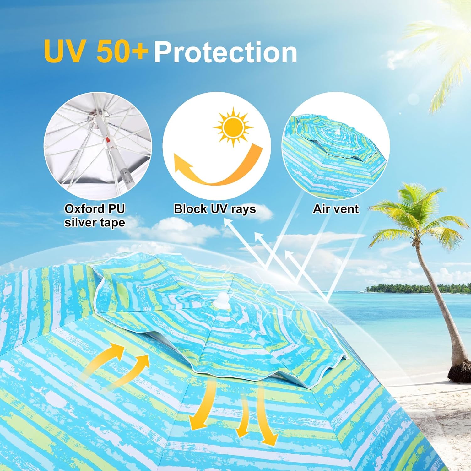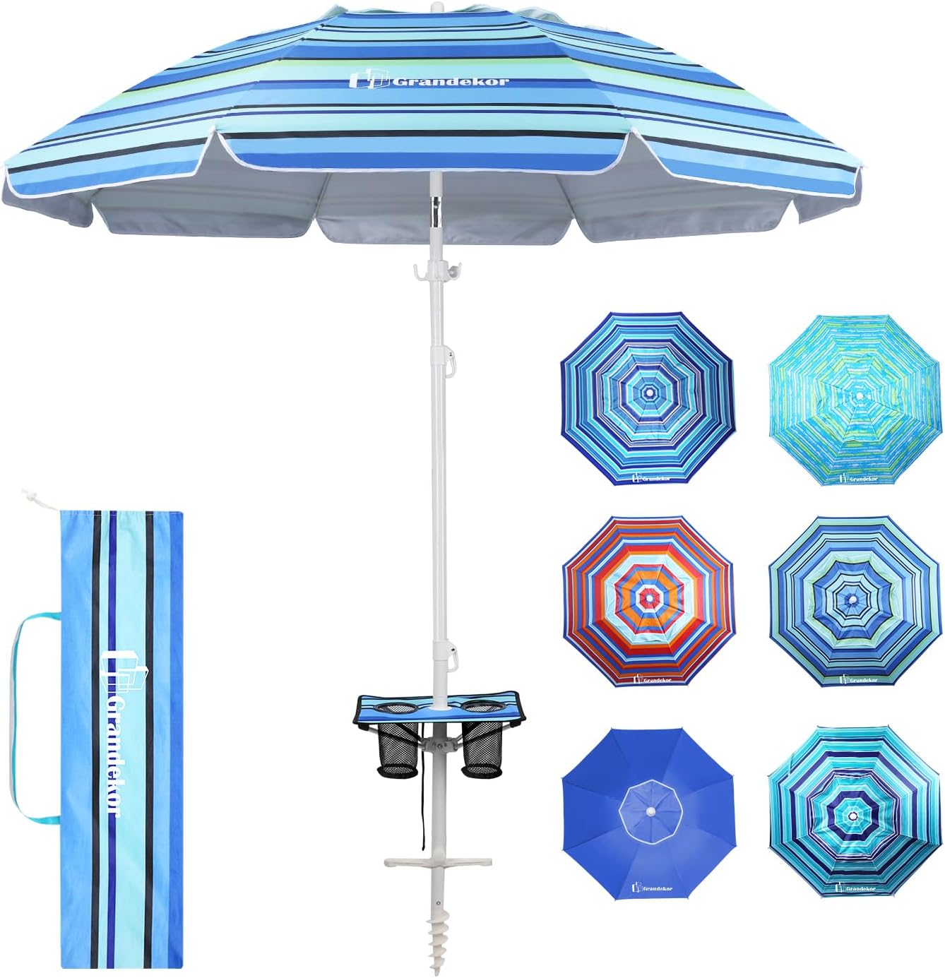 Grandekor 7FT Beach Umbrellas for Sand Heavy Duty Wind Portable Beach Umbrella with Table Travel Beach Umbrella with Carry Bag Sun Umbrella Beach, UV 50+