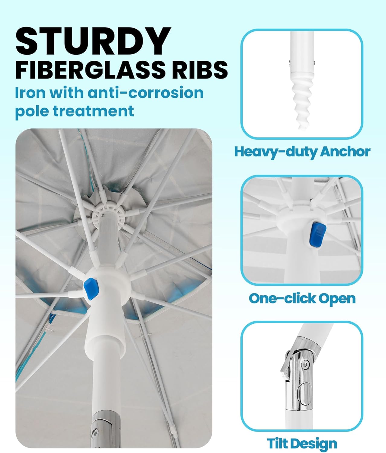 OutdoorMaster Beach Umbrellas with Sandbag & Anchor with 4 Cup Holder, 6.5ft Adjustable Umbrella for Beach Heavy Duty Wind, Portable UPF50+ Sunshade with Carry Bag for Patio,Blue Red with Cup Holder