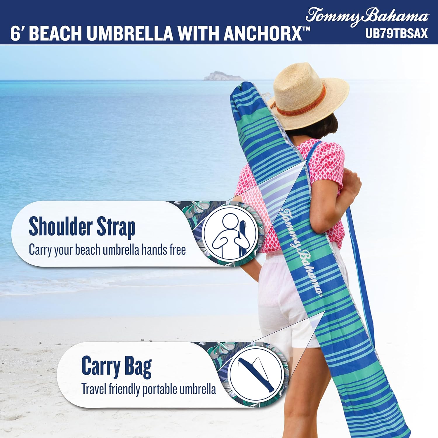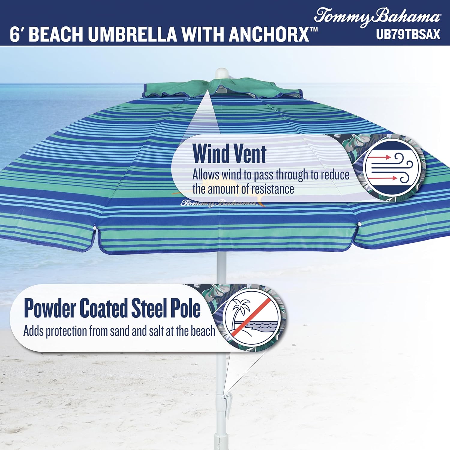 Tommy Bahama ANCHORX Adjustable Beach Umbrella Base System with Sand Anchor and Carrying Bag, SPF 50+ Protection Portable Outdoor Market Umbrella